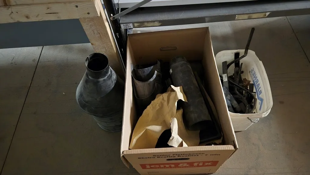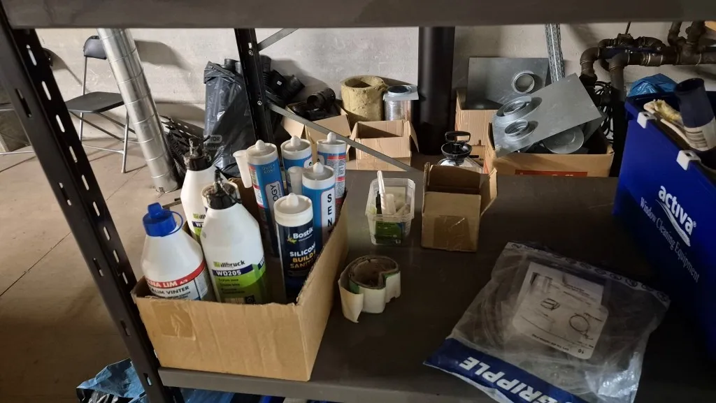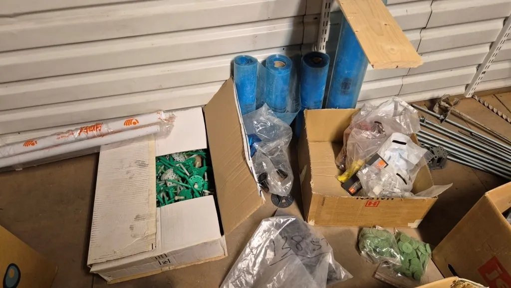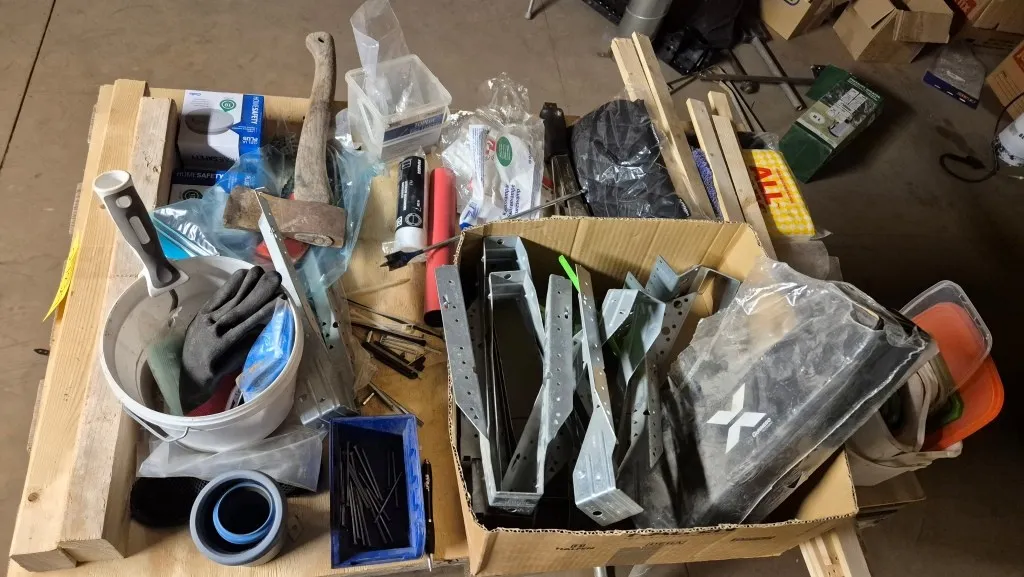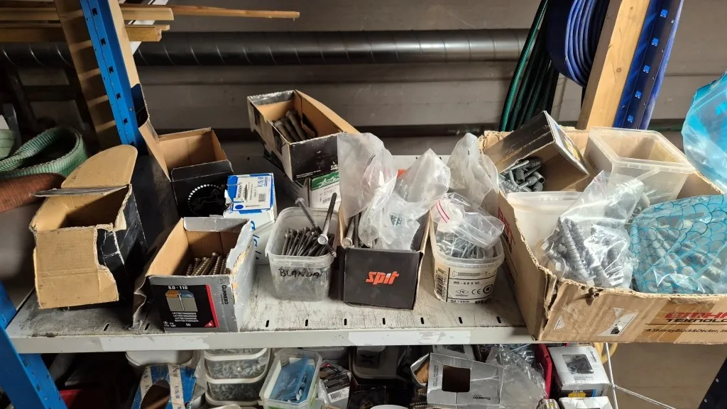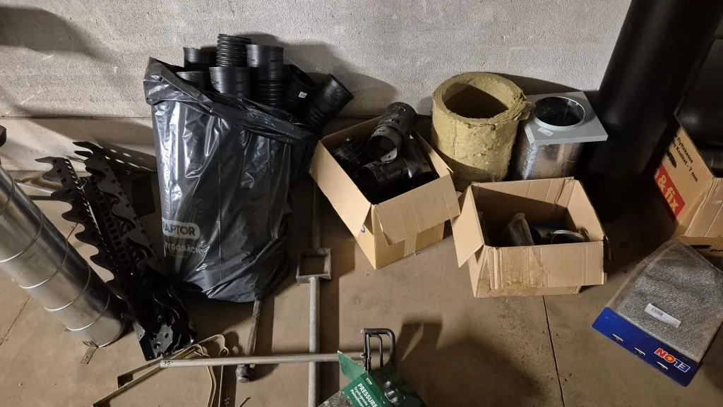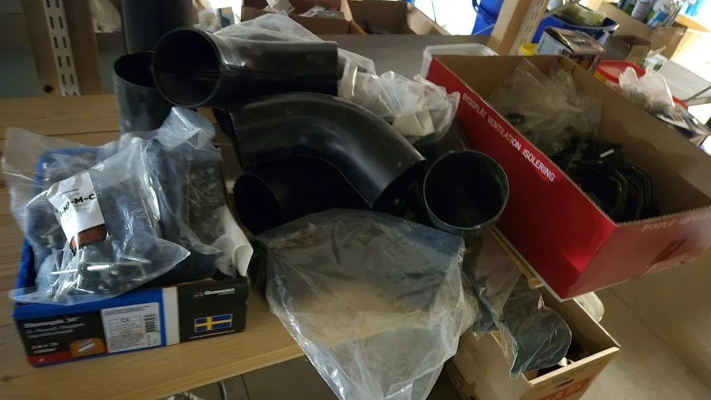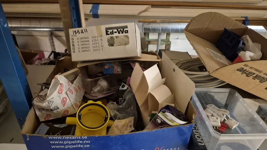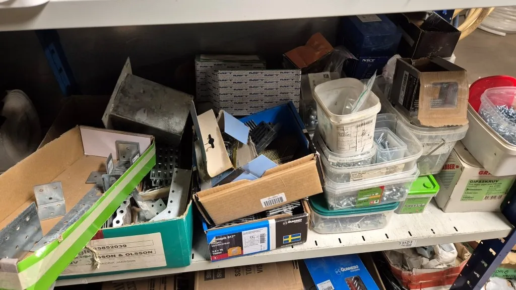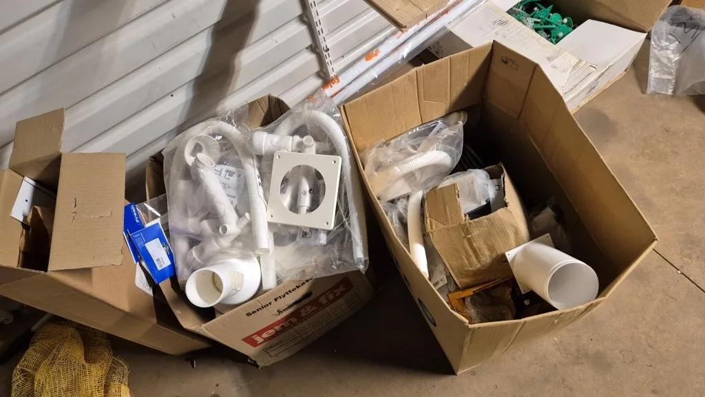 Byggmaterial, skruv, ventilationsdelar, avloppsdelar, el-material med mera.