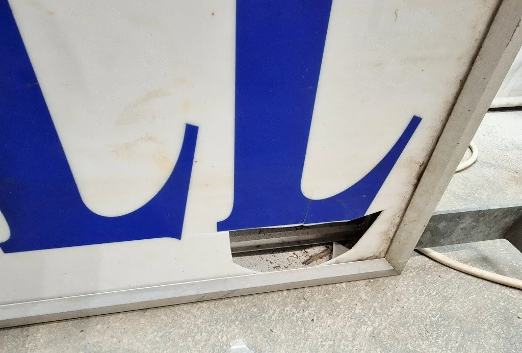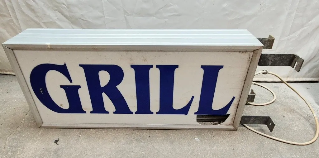 Dubbelsidig ljusskyltMått: 110x51x20cmAnmärkning: trasig dekor på ena sidan, lysrör trasigt