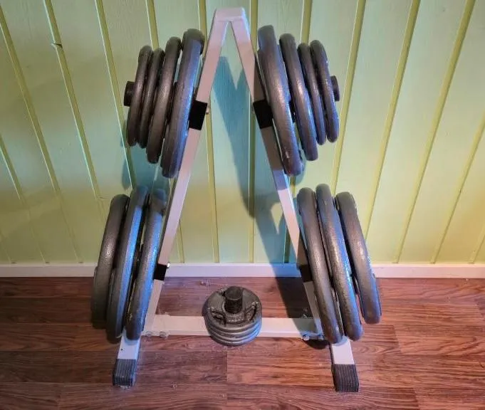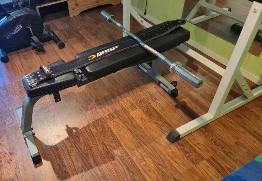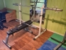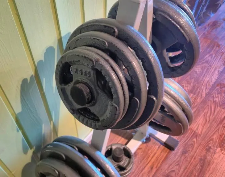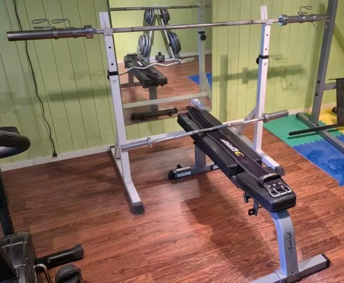 25081. GYMUTRUSTNING PRESSBÄNK + STÄNGER MED VIKTER