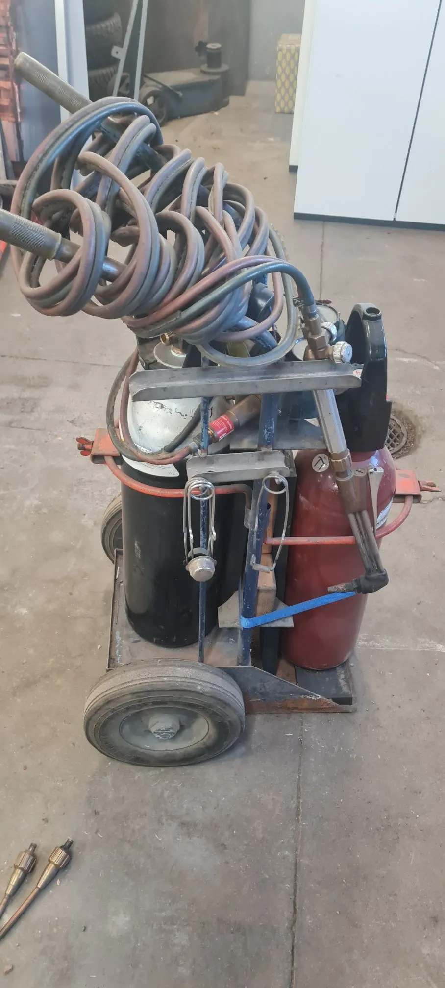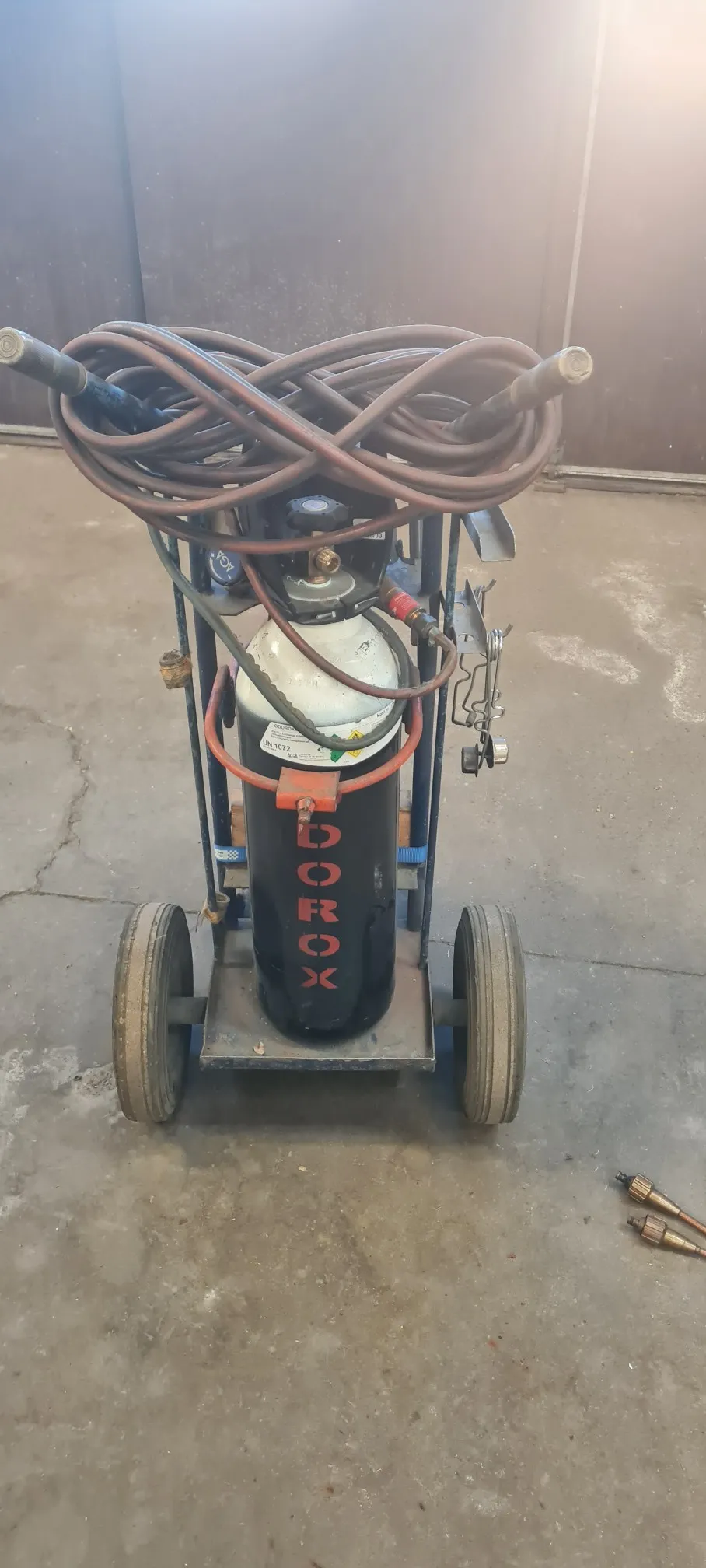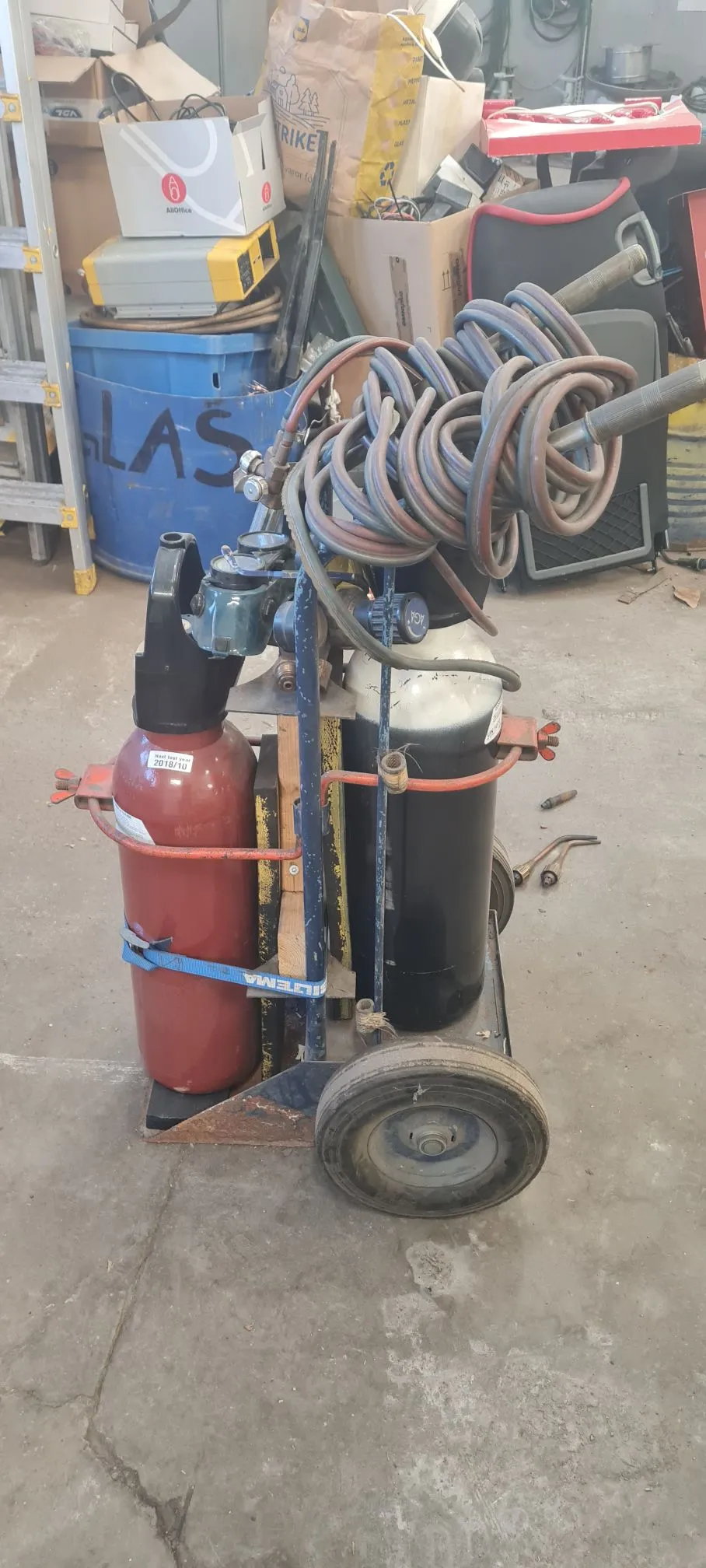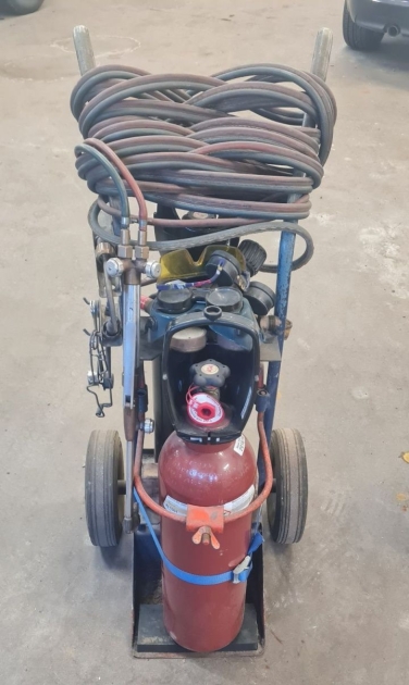 Skärbrännare med gasregulatorer, tubkärra, friköpt gastub Oxygen 10kg, friköpt gastub Acetylen 10kg