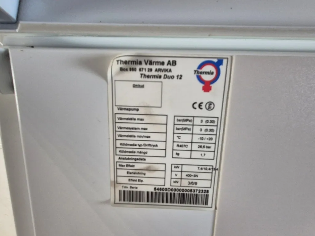 Värmepump Thermia Duo12Anmärkning: Ej funktionstestad, men var enligt uppgift fungerande när den togs ur drift.