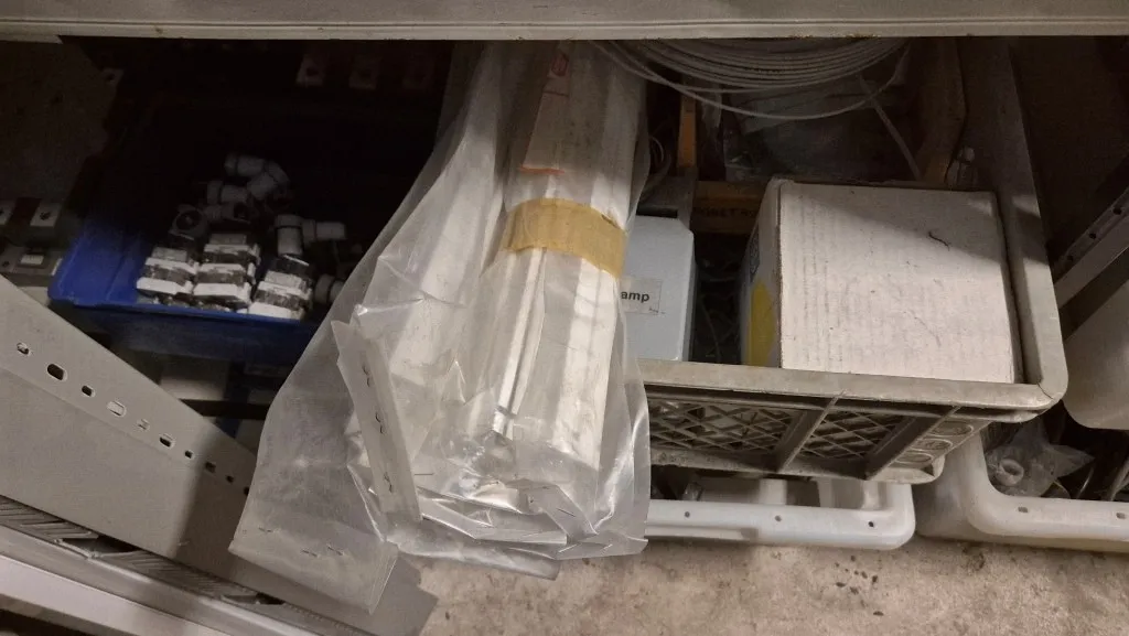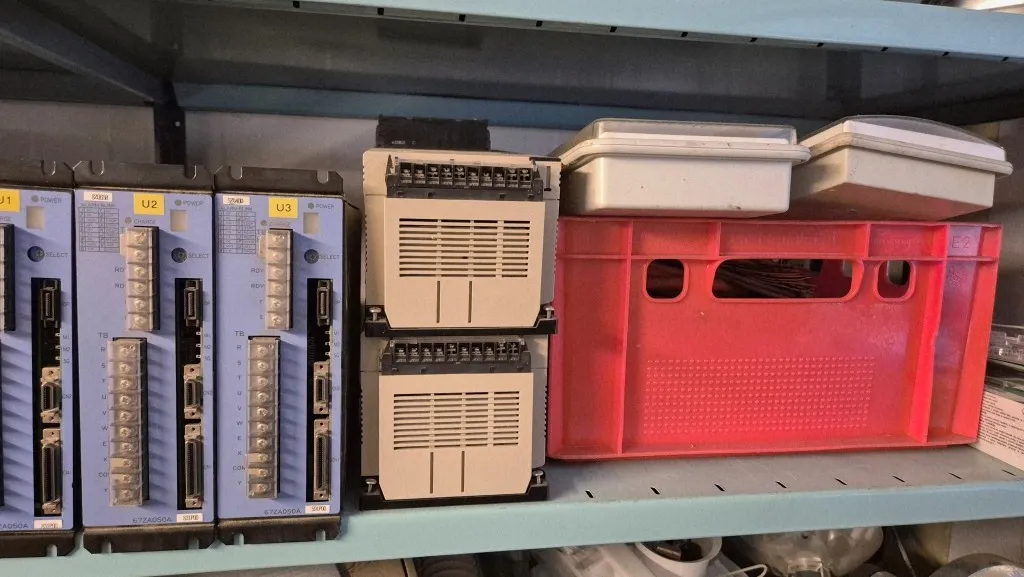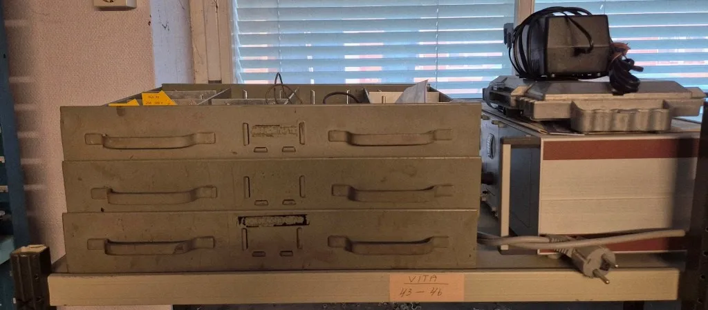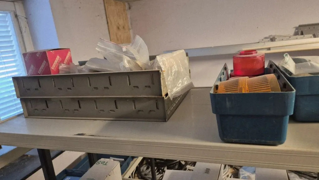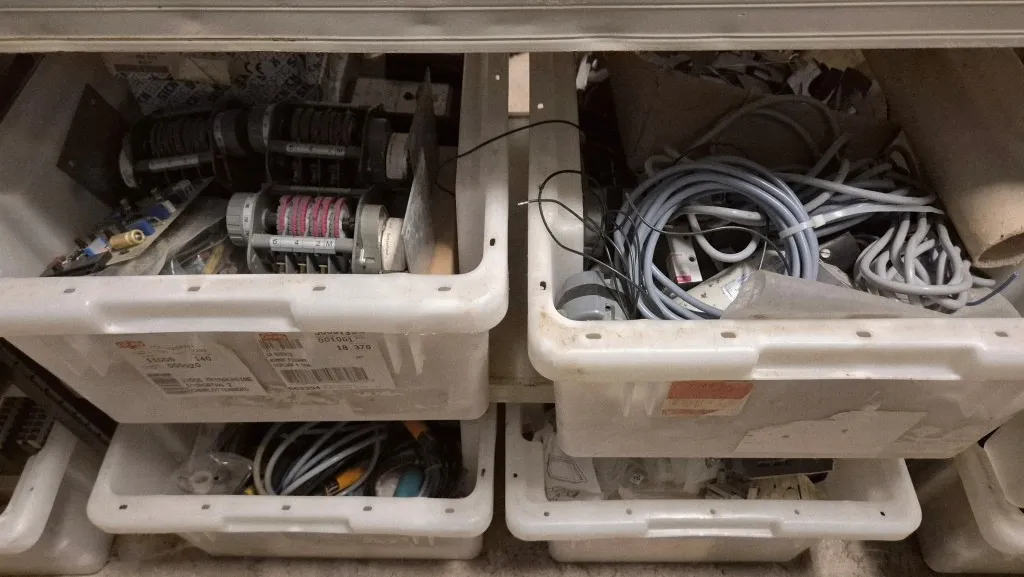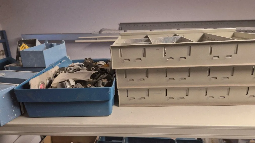 Lagerlådor och plastbackar ingår.